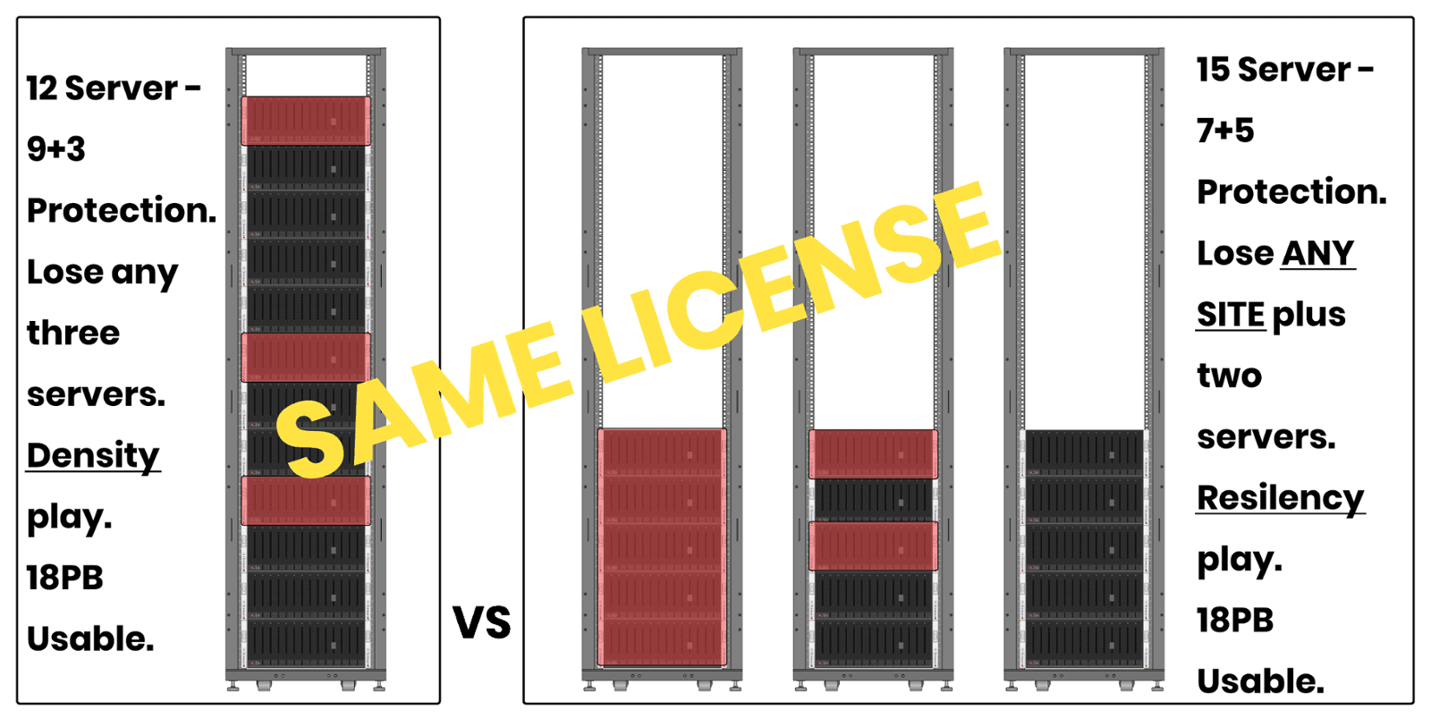 In our picture below, 12 servers with 90 x 24TB HDD's is 26PB of raw capacity. This is what most companies would make you license. Scality uniquely factors out protection overhead. Meaning, a single site standard 9 + 3 protection scheme only requires 18PB of licensing.
