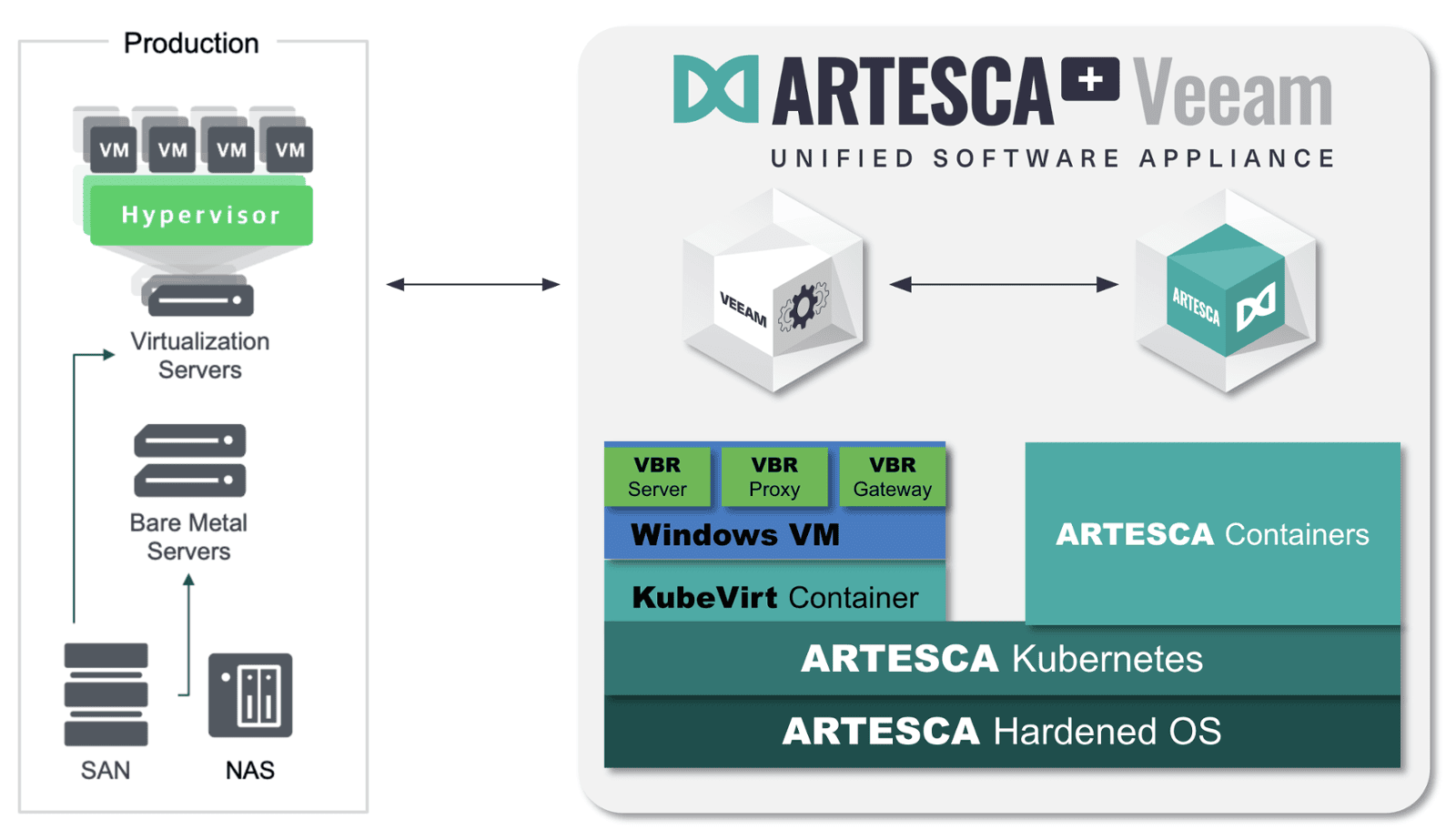 Small but mighty. Think of the ARTESCA+ Veeam unified appliance as all the necessary components for the backup infrastructure. It provides the backup storage target and virtualization infrastructure to host the Veeam backup appliances all on a single device, or cluster. This, on a hardened, secured platform.
