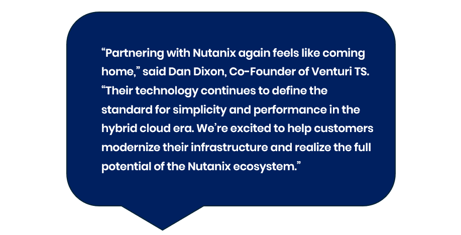 Venturi TS is proud to announce our official partnership with Nutanix, a global leader in hybrid, multicloud computing. This collaboration marks a major milestone for our company, and a meaningful return to familiar ground for our co-founder, Dan Dixon.